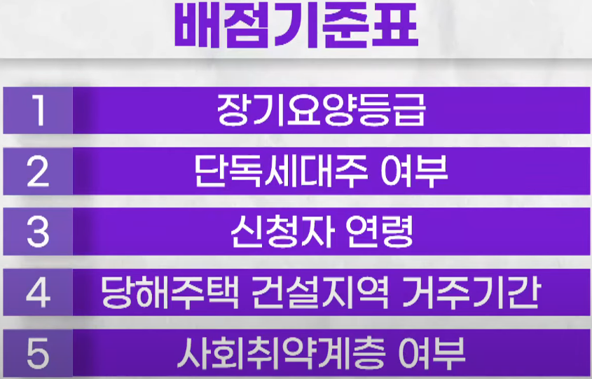 | 추가 조건 | 단독세대주, 장기요양등급 등 점수 배정 |