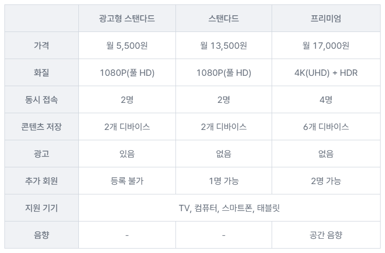 | 프리미엄 | 17,000원 | Ultra HD (4K) + HDR | 4대 | ⭕ (무제한) | ❌ | 돌비 애트모스, 공간 음향 지원 |